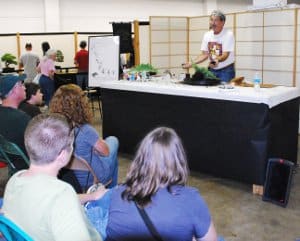 There is something magical about a small group of dedicated people determined to put on a good show. They would arrive on Thursday evening for setup, work into the early hours of Friday morning, go home to grab a few hours of sleep, return to staff the show Friday and Saturday, and complete tear-down on Saturday evening. During the show members would scavenge benches from the fairgrounds, bring them in to seat the audience during demonstrations, and take them back outside after each demo was over. Vern Weeks, one of the club’s founding members, constructed a beautiful tokonoma and would stand for hours in a kimono and slippers answering visitor questions.