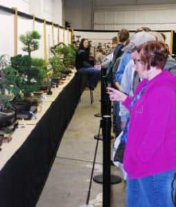 The Minnesota Bonsai Society first participated in the Minnesota State Fair in 1975. That year MBS and the Minnesota Horticultural Society shared the room and held a joint show. The club was only four years old, still small, and the members probably weren’t sure they would have enough trees to fill the room the first year. The show was held in the same room we use today. The white boxes and tiered tables were covered with burlap that first year. A member hand-lettered tree identification tags as the trees were brought in. The bleacher area, hidden now by our cloth backdrops, was used to partition the back of the room into a rest area for members. In the early days a small group of club members spent hours creating their own displays using handmade shoji screens and tokonomas, staffing the show, and promoting bonsai.